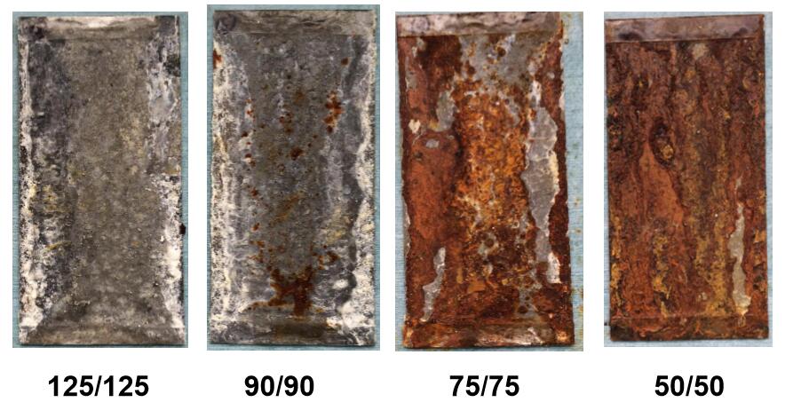 ?封邊鹽霧試驗(2162小時)后,相比50/50g/m2的鍍層產品,厚鍍層產品紅銹面積仍然很低
